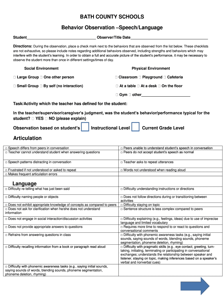 Get the free BO Speech Language Checklist - Bath County Schools - bath k12 ky