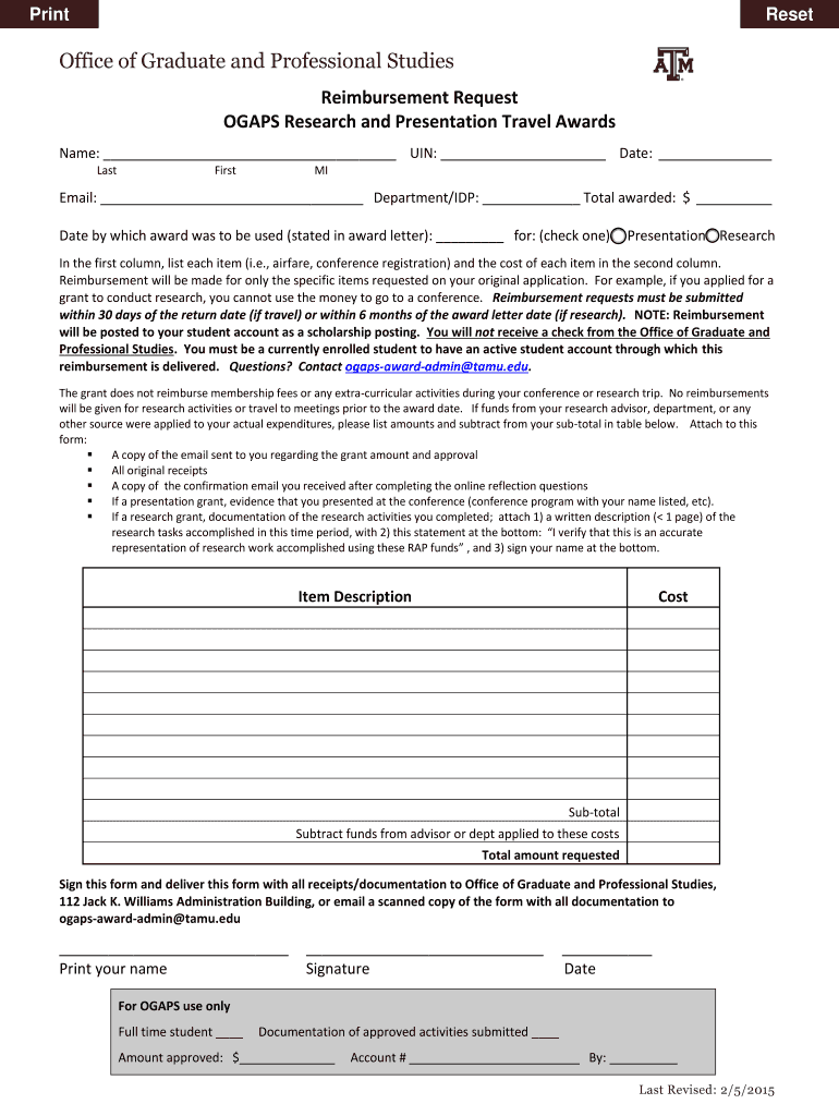 Get the free RAP Travel Award Reimbursement Form - Office Of Graduate Studies - ogaps tamu