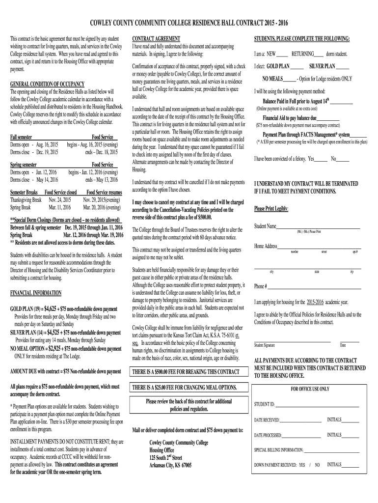 COWLEY COUNTY COMMUNITY COLLEGE RESIDENCE HALL CONTRACT 2015 2016 This contract is the basic agreement that must be signed by any student wishing to contract for living quarters, meals, and services