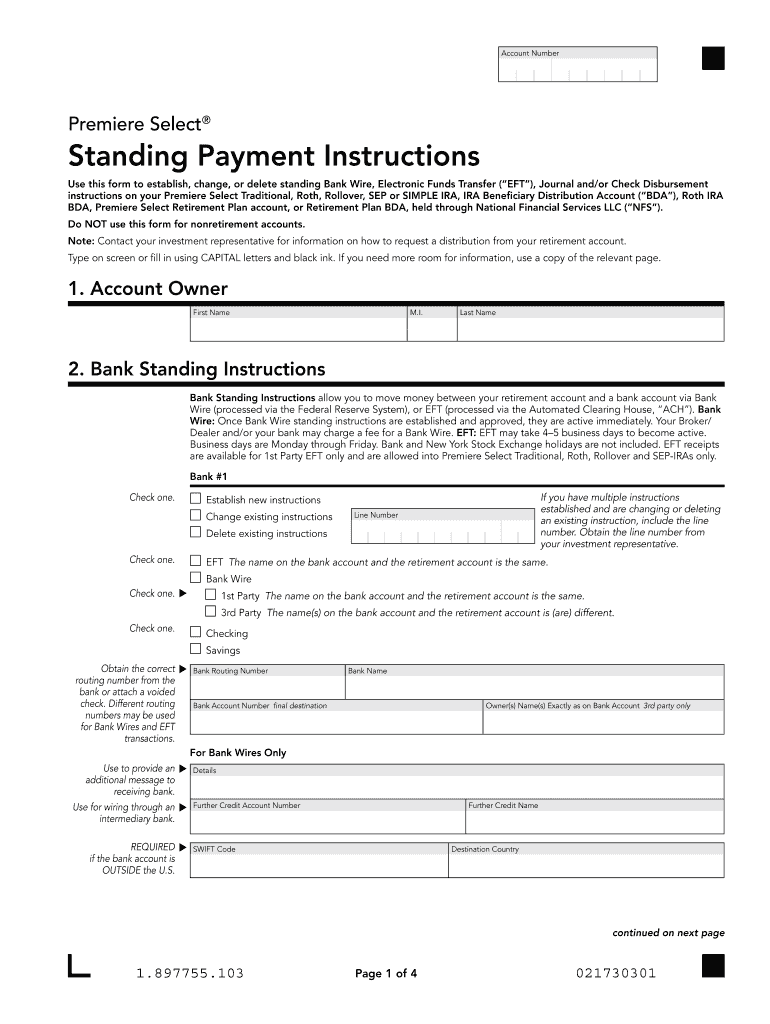 Print Reset Account Number Premiere Select Standing Payment Instructions Use this form to establish, change, or delete standing Bank Wire, Electronic Funds Transfer (EFT), Journal and/or Check Disbursement