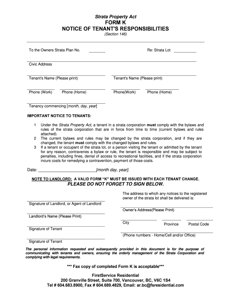 NOTICE OF TENANT IS RESPONSIBILITIES (FORM K) IMPORTANT! Please ensure you sign the Form K before submitting to our office. Thank you. Section 146 of the Strata Property Act of British Columbia stipulates