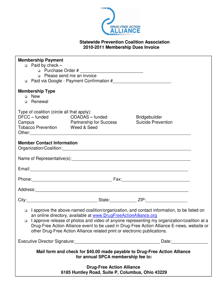 Statewide Prevention Coalition Association 20102011 Membership Dues Invoice Membership Payment Paid by check Purchase Order # Please send me an invoice Paid via Google Payment Confirmation # Membership