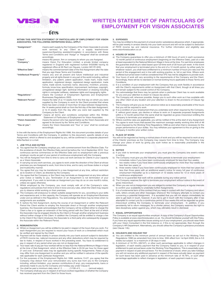 WRITTEN STATEMENT OF PARTICULARS OF EMPLOYMENT FOR VISION ASSOCIATES WITHIN THIS WRITTEN STATEMENT OF PARTICULARS OF EMPLOYMENT FOR VISION ASSOCIATES, THE FOLLOWING DEFINITIONS SHALL APPLY: Assignment: