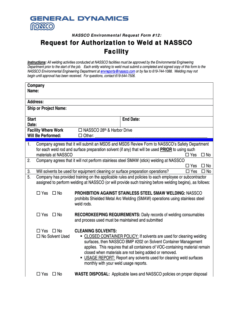 NAS SCO Environmental Request Form #12: Request for Authorization to Weld at NAS SCO Facility Instructions: All welding activities conducted at NAS SCO facilities must be approved by the Environmental