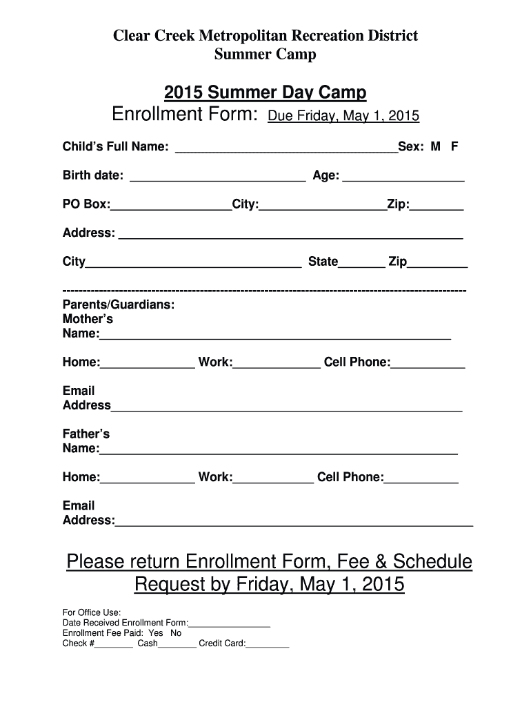 Clear Creek Metropolitan Recreation District Summer Camp Dear Parents: Summer 2015 is approaching fast and the planning is in full swing. The program runs from Monday, June 1st through Friday, August