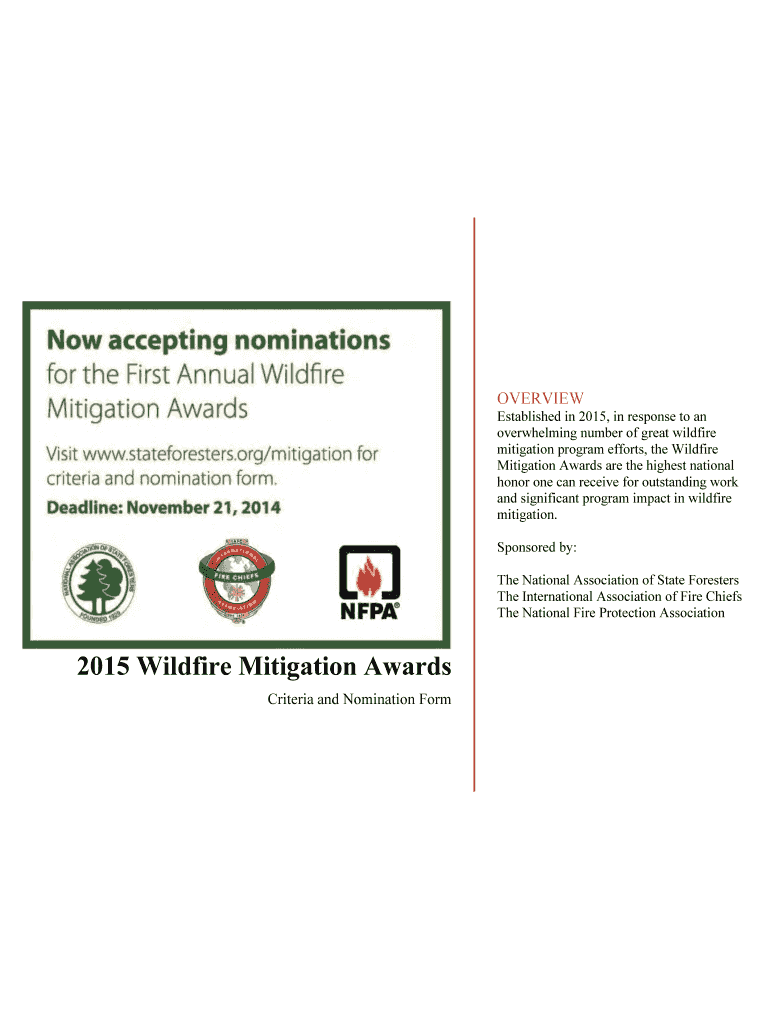 OVERVIEW Established in 2015, in response to an overwhelming number of great wildfire mitigation program efforts, the Wildfire Mitigation Awards are the highest national honor one can receive for