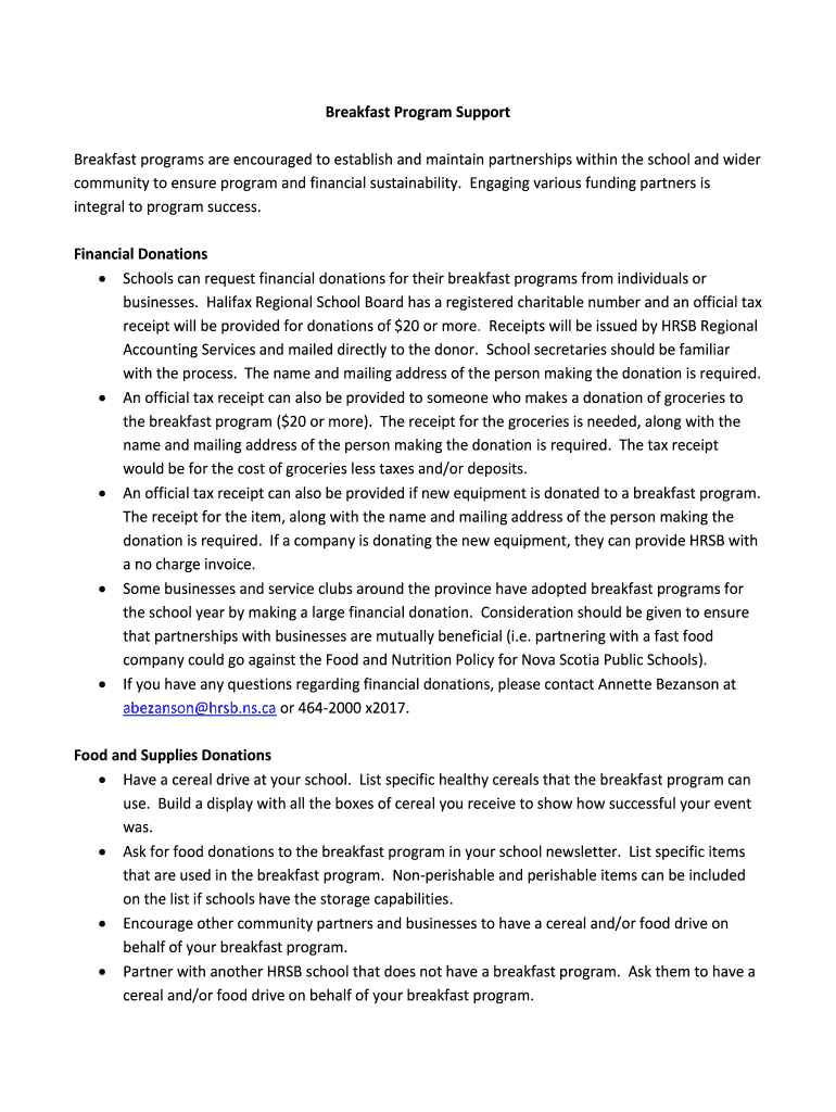 Breakfast Program Support Breakfast programs are encouraged to establish and maintain partnerships within the school and wider community to ensure program and financial sustainability. Engaging various