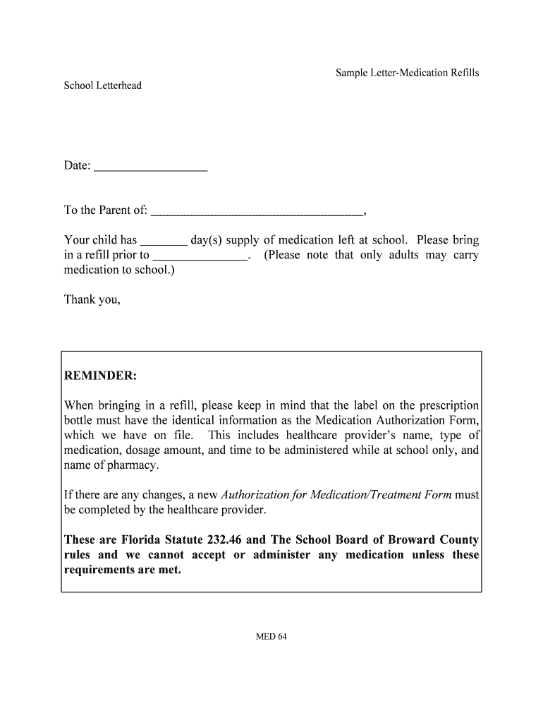medication to school.)day(s) supply of medication left at school. Please bring. (Please