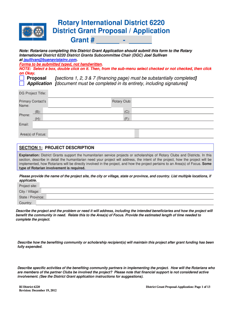 Rotary International District 6220 Instructions for District Grant Proposal / Application and Grant Reports What is a District Grant? District Grants are for Rotary Districts to support short term,