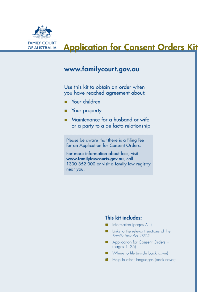 FAMILY COURT OF AUSTRALIA Application for Consent Orders Kit www.familycourt.gov.au Use this kit to obtain an order when you have reached agreement about: n Your children n Your property n Maintenance