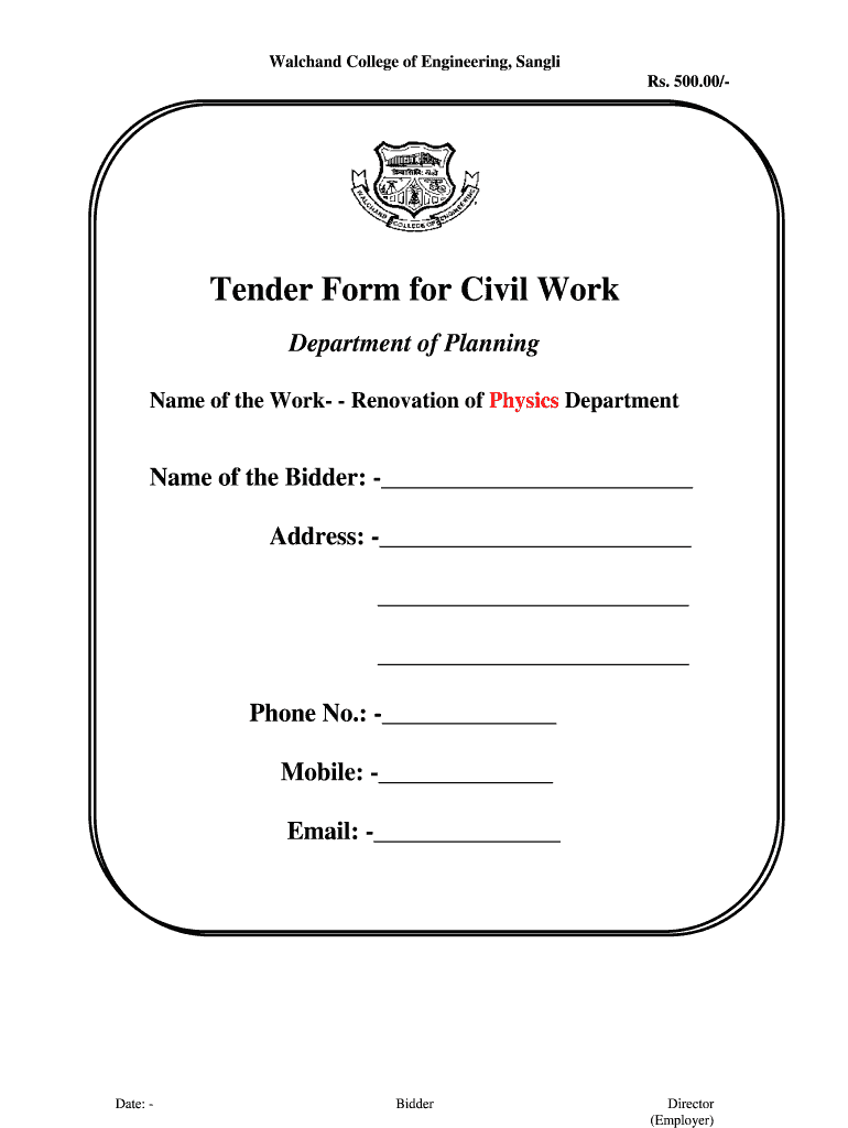 Watchband College of Engineering, Single Rs. 500.00/ Tender Form for Civil Work Department of Planning Name of the Work Renovation of Physics Department Name of the Bidder: Address: Phone No.: Mobile: