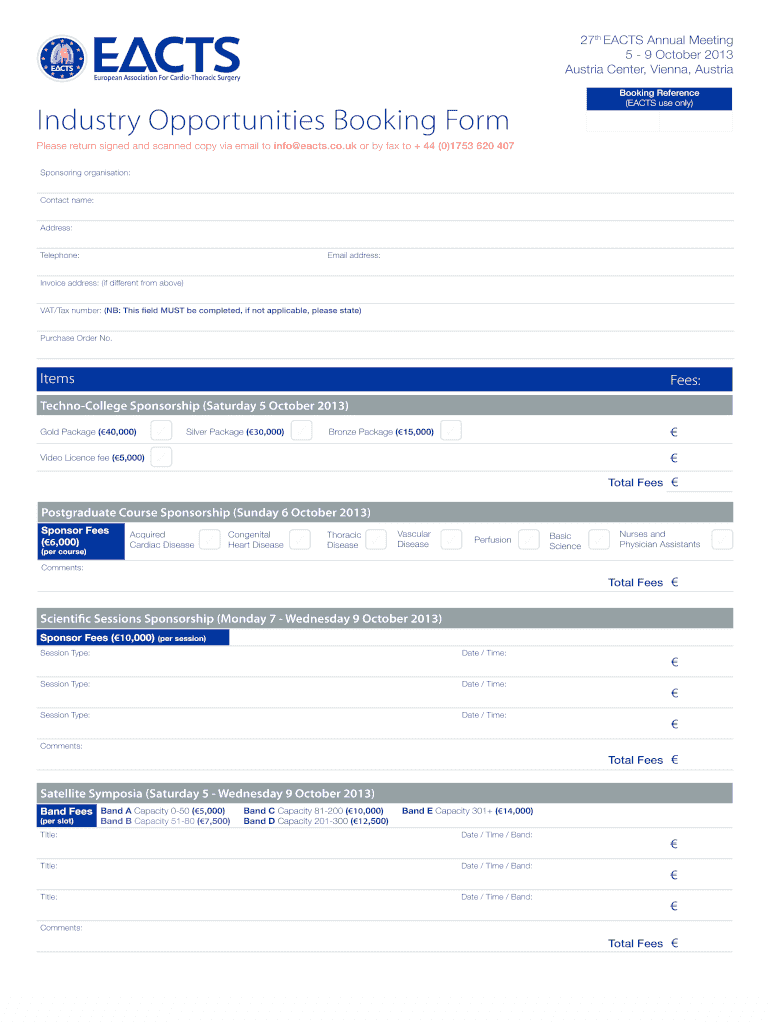 27th ACTS Annual Meeting 5 9 October 2013 Austria Center, Vienna, Austria Booking Reference (ACTS use only) Industry Opportunities Booking Form Please return signed and scanned copy via email to info