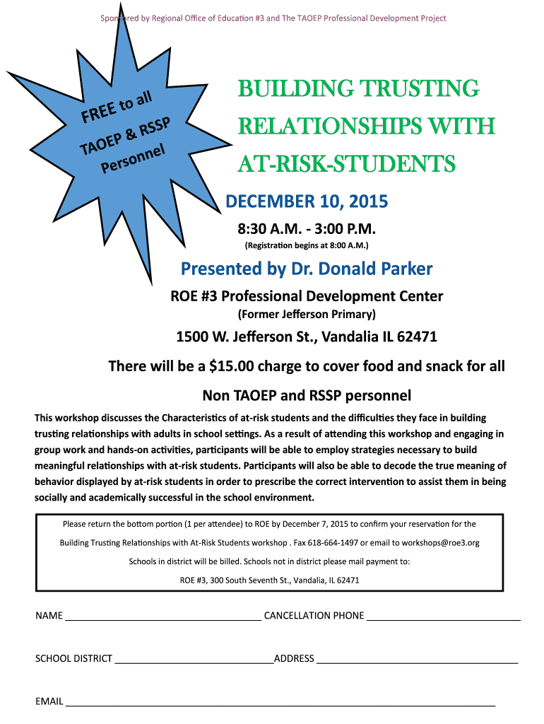 Sponsored by Regional Office of Education #3 and The TA OEP Professional Development Project BUILDING TRUSTING RELATIONSHIPS WITH ATRISKSTUDENTS DECEMBER 10, 2015 8:30 A.M. 3:00 P.M. (Registration