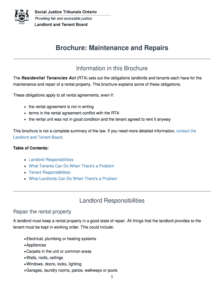 Brochure: Maintenance and Repairs Information in this Brochure The Residential Tenancies Act (RTA) sets out the obligations landlords and tenants each have for the maintenance and repair of a rental