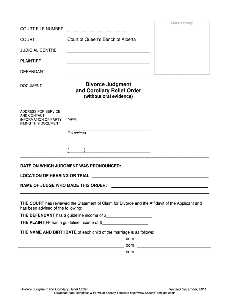 Clerks Stamp COURT FILE NUMBER Court of Queen's Bench of Alberta COURT JUDICIAL Center PLAINTIFF DEFENDANT Divorce Judgment and Corollary Relief Order DOCUMENT (without oral evidence) ADDRESS FOR