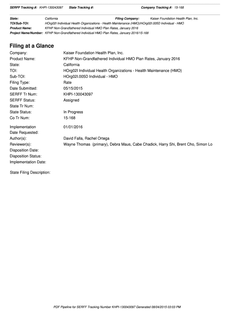 SERFS Tracking #: KHPI130043097 State Tracking #: Company Tracking #: 15168 State: California TO/Subtle: HOrg02I Individual Health Organizations Health Maintenance (HMO)/HOrg02I.005D Individual HMO