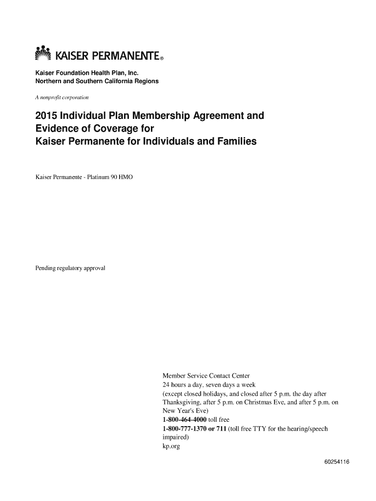 Get the free Kaiser Permanente - 2015 Individual Plan Membership Agreement and Evidence of Covera...