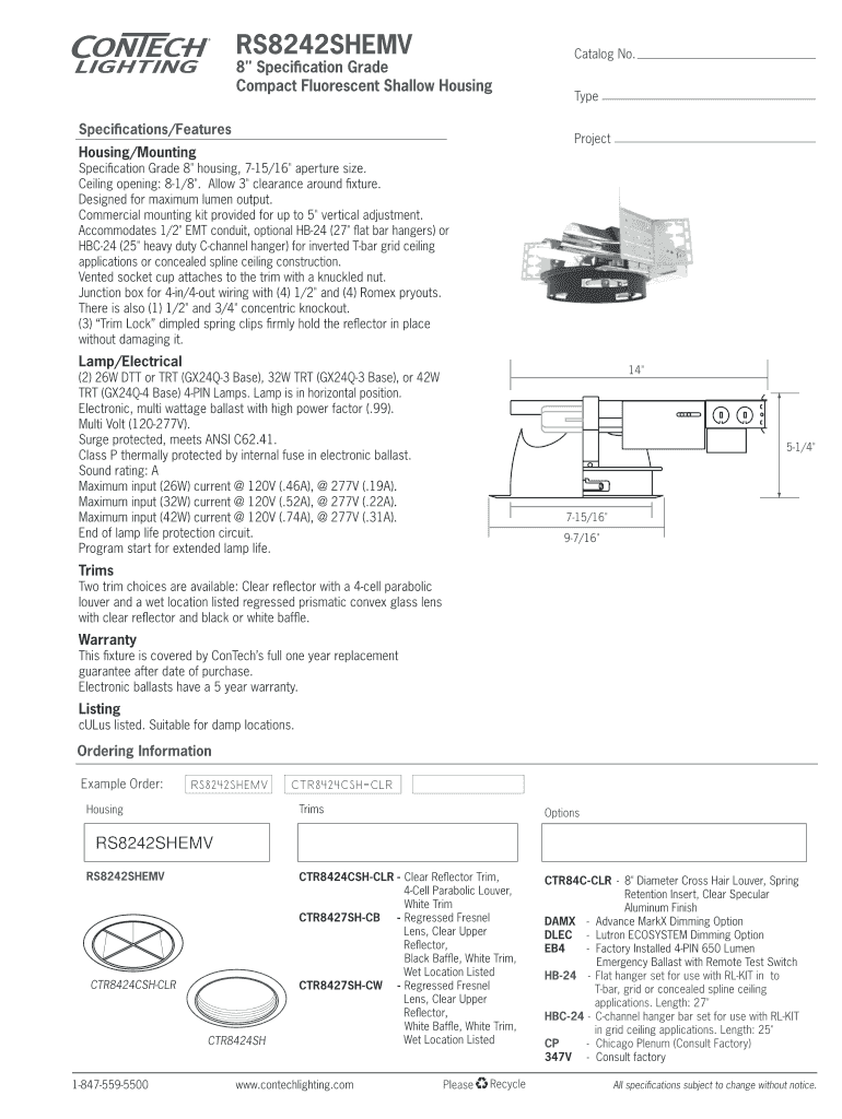 RS8242SHEMV 8 Speciation Grade Compact Fluorescent Shallow Housing Speciations/Features Catalog No. Type Project Housing/Mounting Speciation Grade 8 housing, 715/16 aperture size. Ceiling opening: