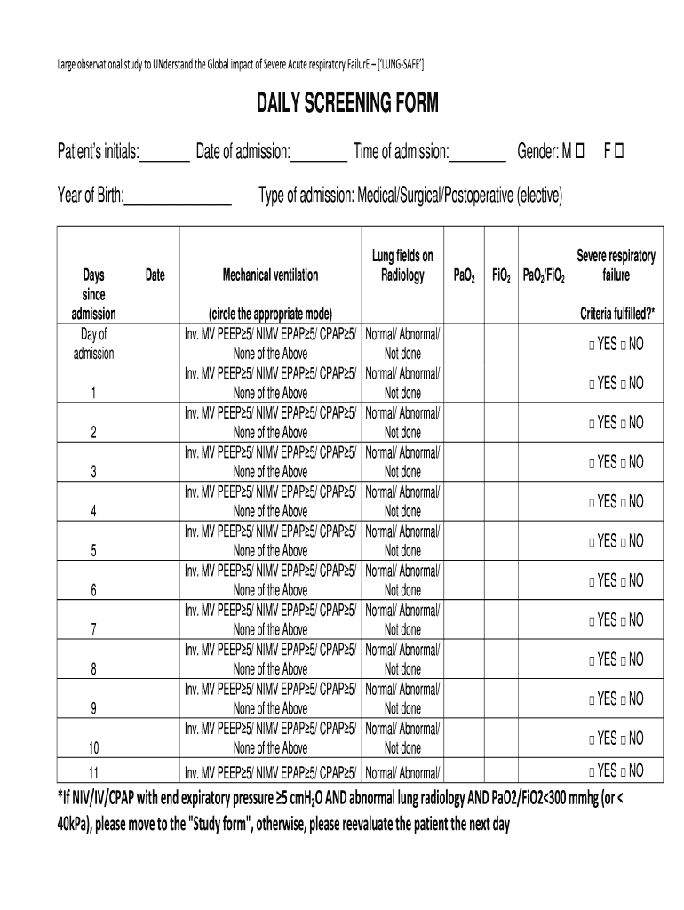 Large observational study to Understand the Global impact of Severe Acute respiratory Failure LUNGS AFE DAILY SCREENING FORM Patients initials: Date of admission: Time of admission: Year of Birth: