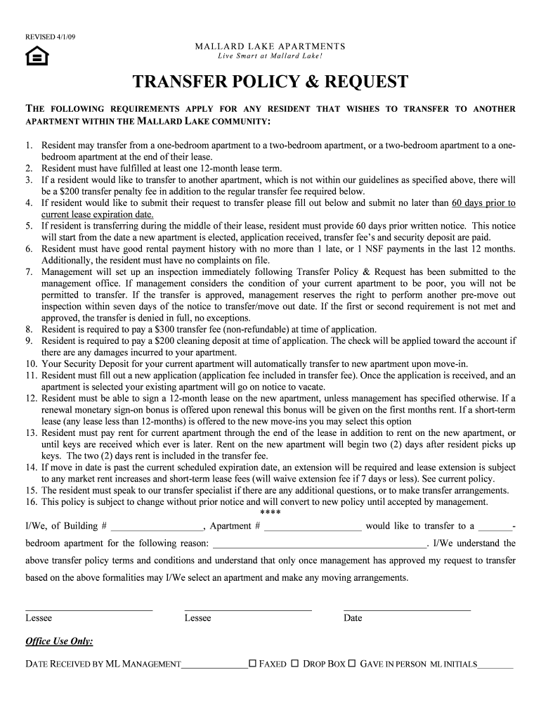 FOLLOWING REQUIREMENTS APPLY FOR ANY RESIDENT THAT WISHES TO TRANSFER TO ANOTHER