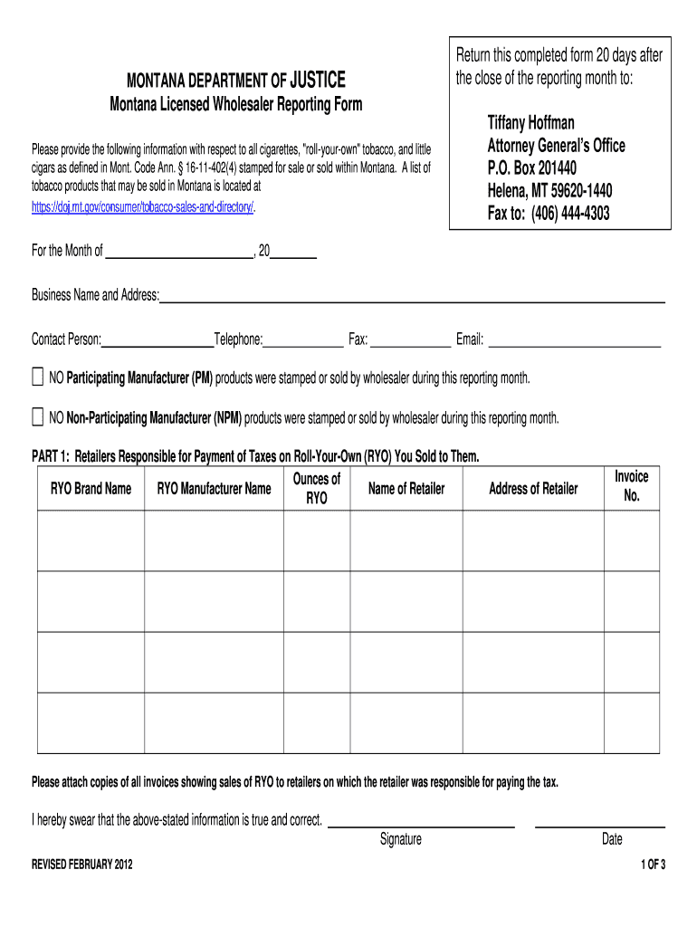 Return this completed form 20 days after the close of the reporting month to: MONTANA DEPARTMENT OF JUSTICE Montana Licensed Wholesaler Reporting Form Please provide the following information with