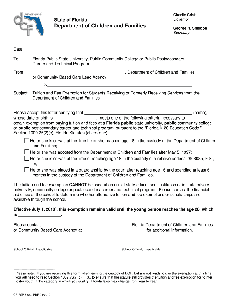 Charlie Christ Governor State of Florida Department of Children and Families George H. Sheldon Secretary Clear Date: To: Florida Public State University, Public Community College or Public Postsecondary