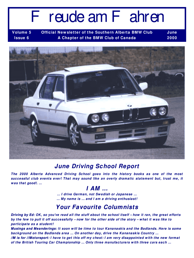 Freud am Fallen Volume 5 Issue 6 Official Newsletter of the Southern Alberta BMW Club A Chapter of the BMW Club of Canada June 2000 June Driving School Report The 2000 Alberta Advanced Driving School
