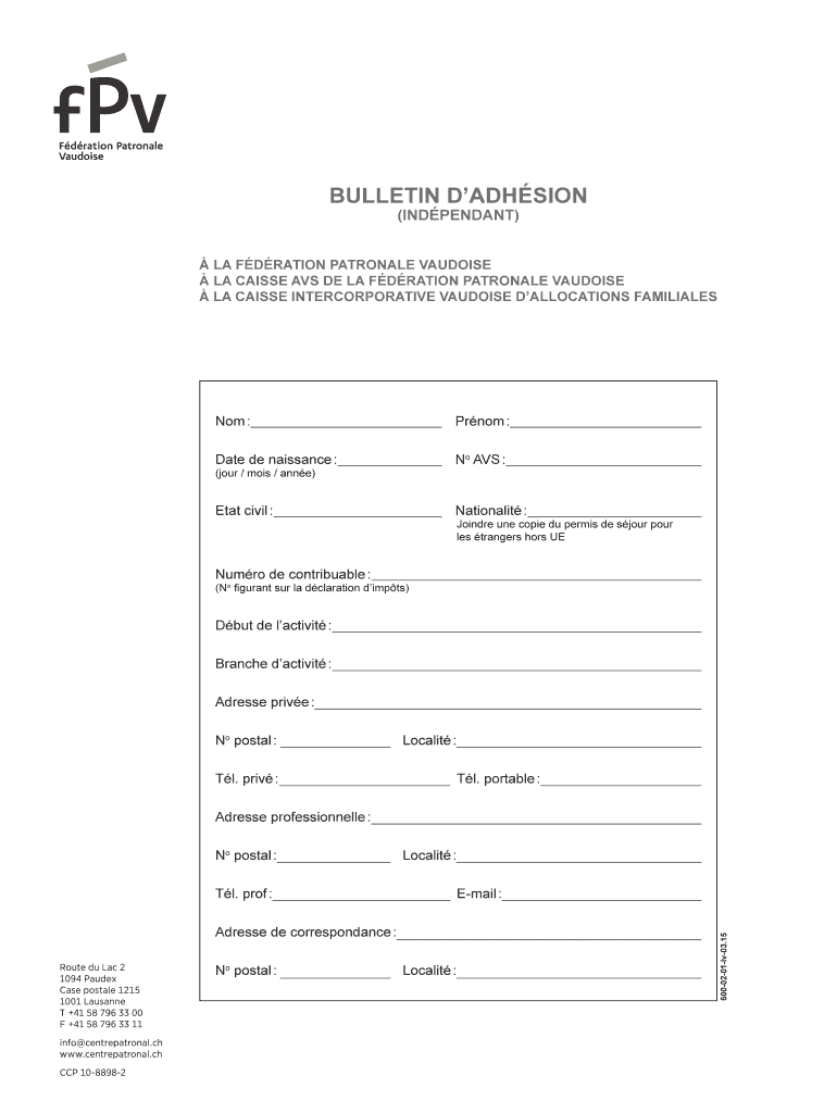 BULLETIN ADHESION (ind pendant) la Formation patronage advise la Case AVS DE la Formation patronage advise la Case interoperative advise allocations familial BS Not: Prom: Date de Renaissance: No