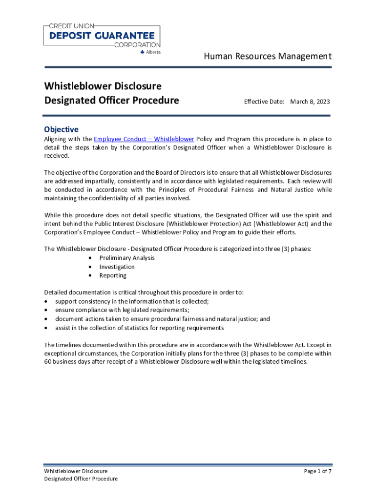 Human Resources ManagementWhistleblower Disclosure Designated Officer ProcedureEffective Date: March 8, 2023ObjectiveAligning with the Employee Conduct Whistleblower Policy and Program this procedure