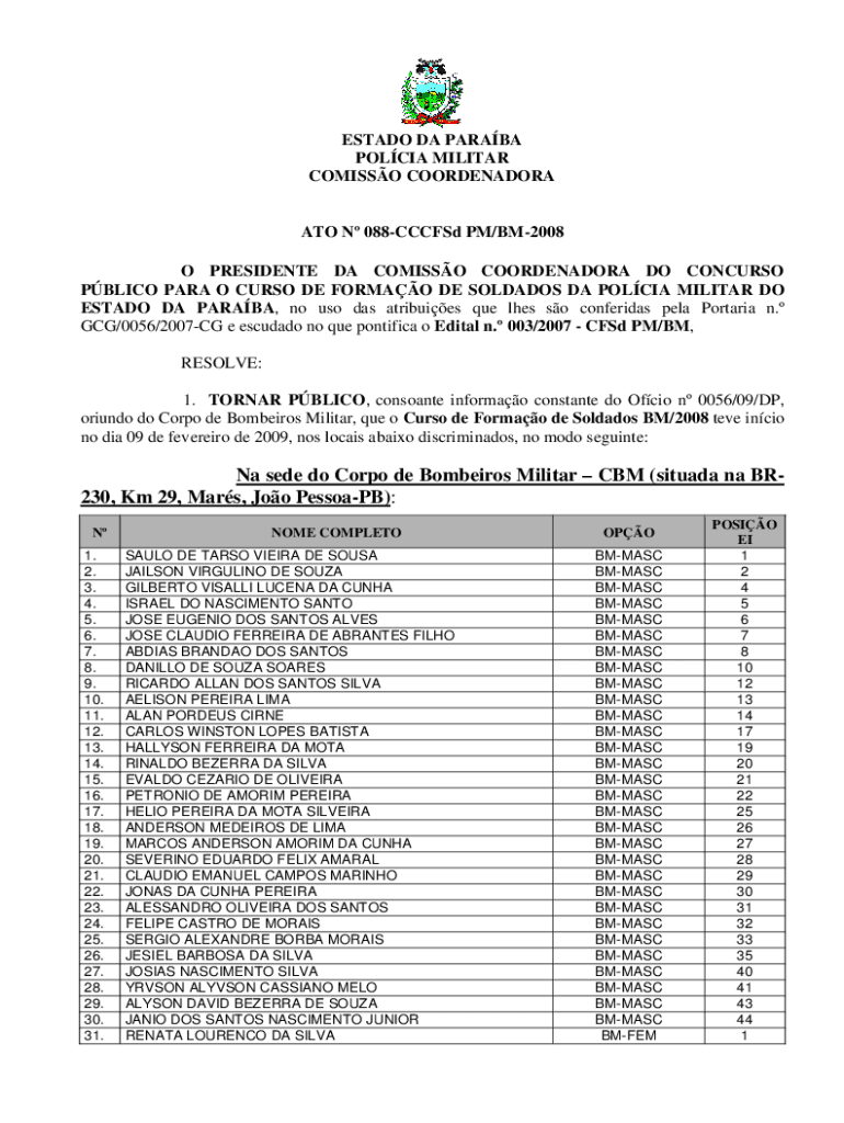 ESTATE DA Paraná POL CIA MILITARY COMICS COORDINATOR ATO N 088CCCFSd PM/BM2008 O PRESIDENT EDA COMICS COORDINATOR DO CONCURS PBL ICO PARA O CURS ODE FORMAT DE SOLDIERS DA POL CIA MILITARY DO ESTATE