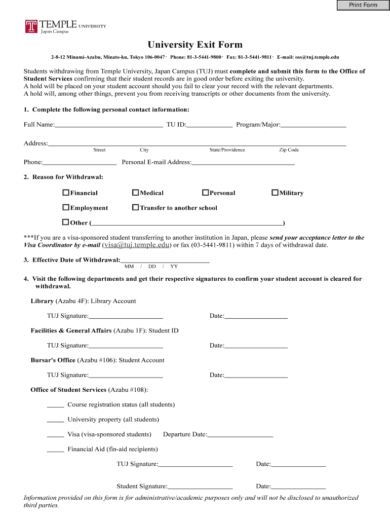 Print Form University Exit Form 2812 MinamiAzabu, Minatory, Tokyo 1060047Phone: 81354419800Fax: 81354419811Email: OSS tub.temple.edu Students withdrawing from Temple University, Japan Campus (TUB)