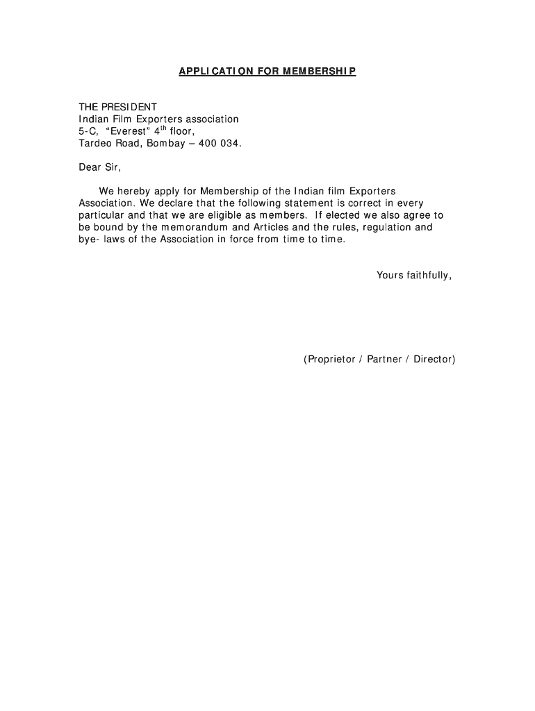 This document is a formal application for membership to the Indian Film Exporters Association, requiring the applicant to provide personal and business details along with compliance to the association's