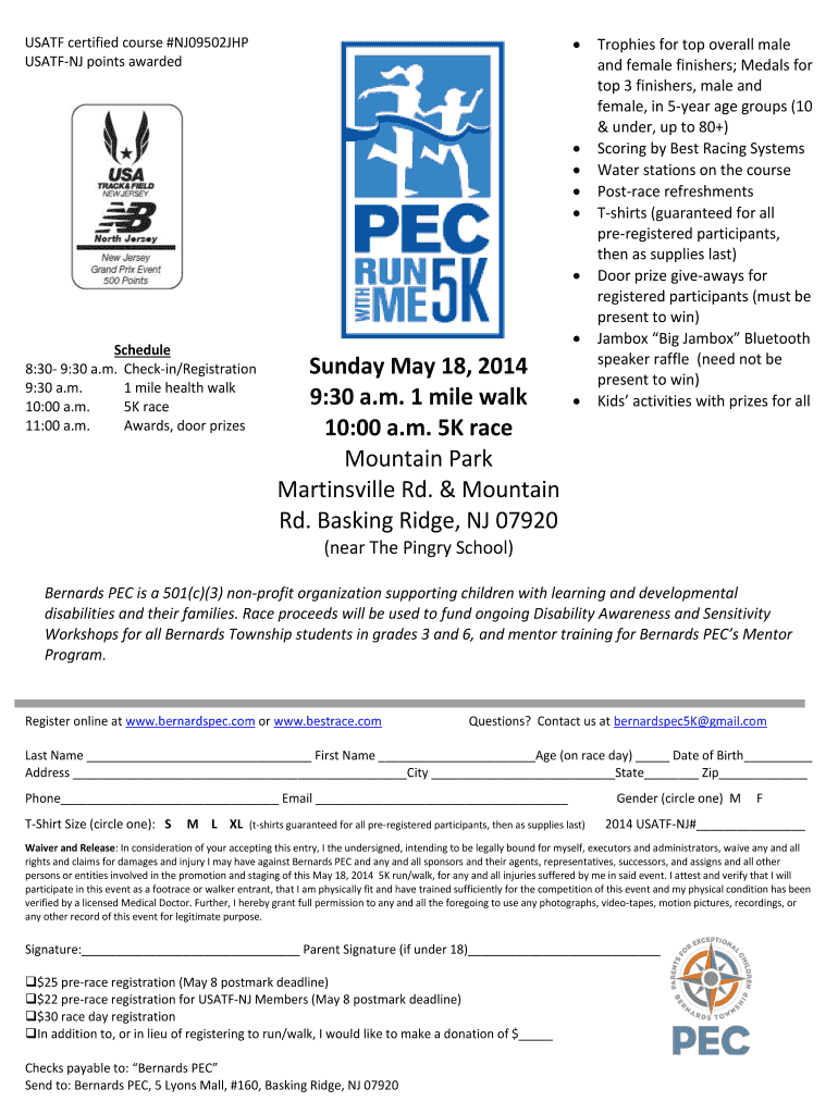 USAF certified course #NJ09502JHP USAF points awarded Schedule 8:30 9:30 a.m. Checking/Registration 9:30 a.m. 1 mile health walk 10:00 a.m. 5K race 11:00 a.m. Awards, door prizes Sunday, May 18, 2014