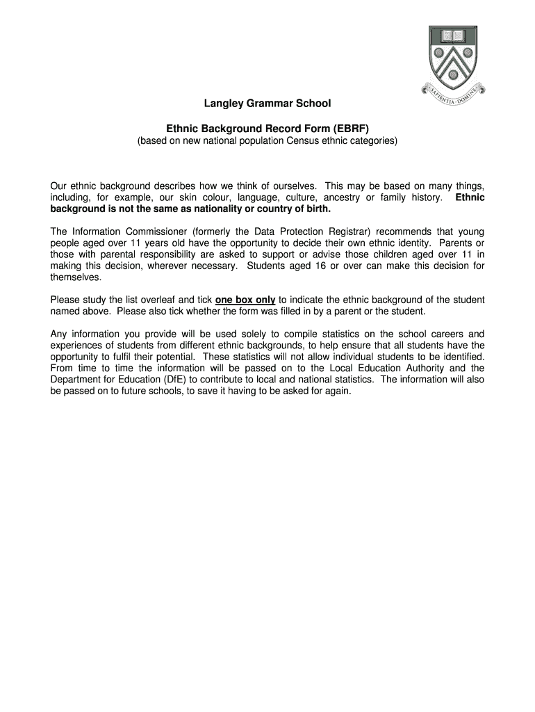Langley Grammar School Ethnic Background Record Form (EBRO) (based on new national population Census ethnic categories) Our ethnic background describes how we think of ourselves. This may be based