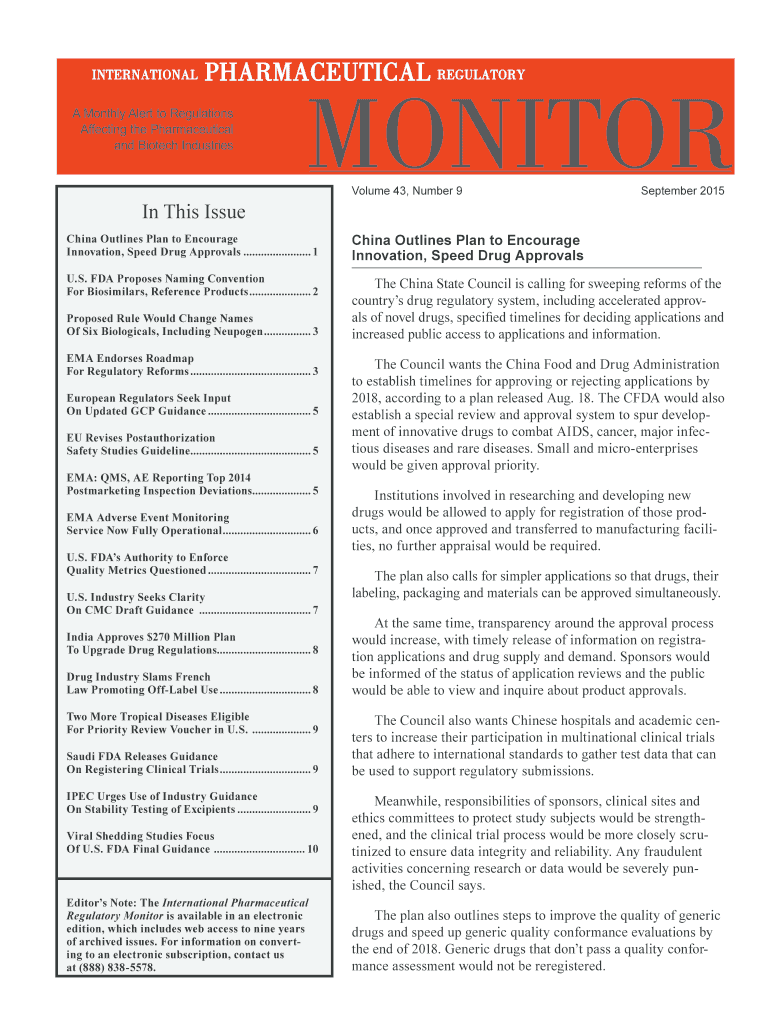 INTERNATIONAL PHARMACEUTICAL REGULATORY A Monthly Alert to Regulations Affecting the Pharmaceutical and Biotech Industries MONITOR In This Issue Volume 43, Number 9 September 2015 China Outlines Plan