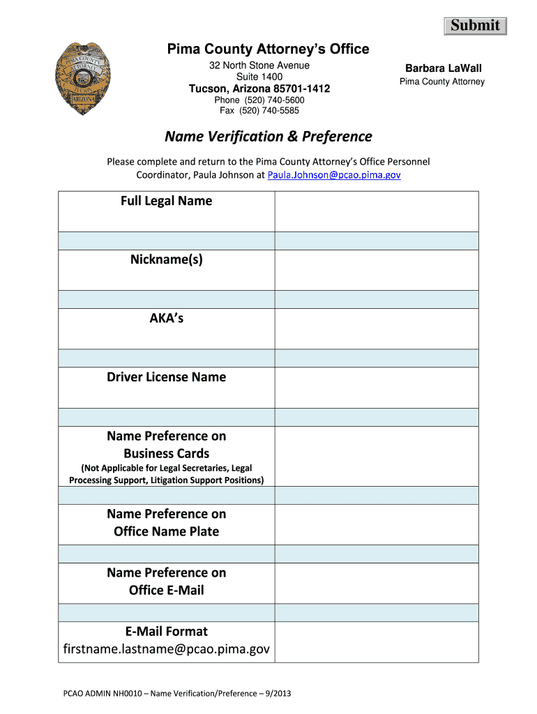 Submit Pima County Attorneys Office 32 North Stone Avenue Suite 1400 Tucson, Arizona 857011412 Barbara La Wall Pima County Attorney Phone (520) 7405600 Fax (520) 7405585 Name Verification & Preference