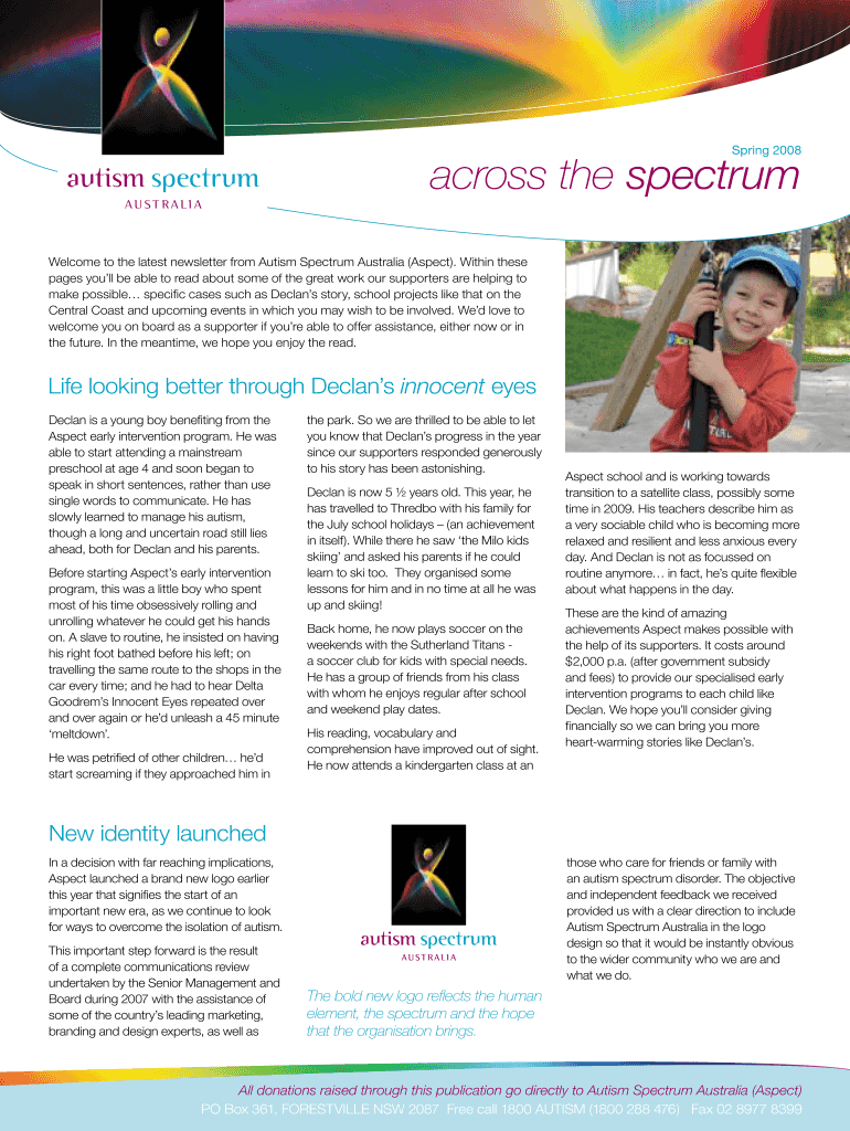 Spring 2008 across the spectrum Welcome to the latest newsletter from Autism Spectrum Australia (Aspect). Within these pages you'll be able to read about some great work our supporters are helping