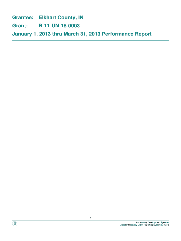 Grantee: Elkhart County, IN Grant: B11UN180003 January 1, 2013, through March 31, 2013, Performance Report 1 Community Development Systems Disaster Recovery Grant Reporting System (DRG) Grant Number: