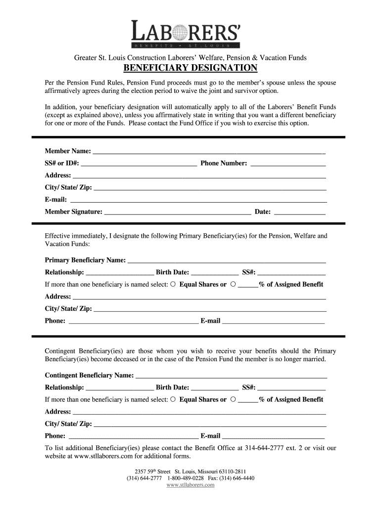 Greater St. Louis Construction Laborers Welfare, Pension & Vacation Funds BENEFICIARY DESIGNATION Per the Pension Fund Rules, Pension Fund proceeds must go to the members spouse unless the spouse