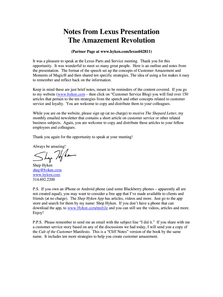 It was a pleasure to speak at the Lexus Parts and Service meeting. Thank you for this