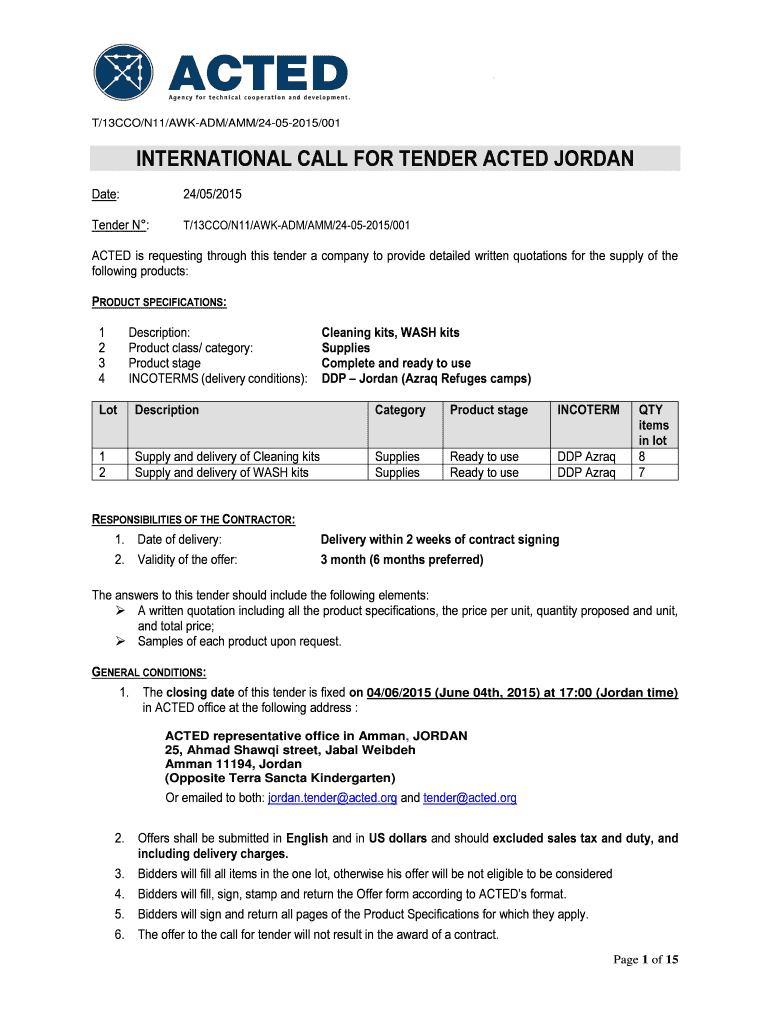 T/13CCO/N11/AWK ADM/AMM/24052015/001 INTERNATIONAL CALL FOR TENDER ACTED JORDAN Date: 24/05/2015 Tender N: T/13CCO/N11/AWK ADM/AMM/24052015/001 ACTED is requesting through this tender a company to