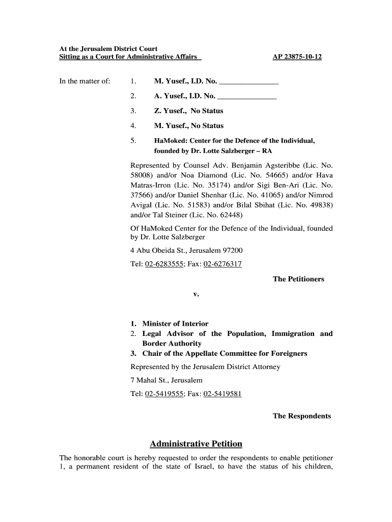 At the Jerusalem District Court Sitting as a Court for Administrative Affairs In the matter of: AP 238751012 1. M. Yosef., I.D. No. 2. A. Yosef., I.D. No. 3. Z. Yosef., No Status 4. M. Yosef., No