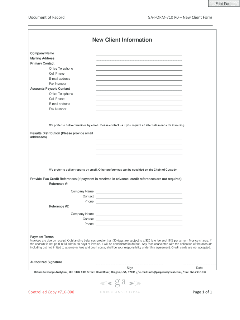 Print Form Document of Record GAFORM710 R0 New Client Form New Client Information Company Name Mailing Address Primary Contact Office Telephone Cell Phone Email address Fax Number Accounts Payable