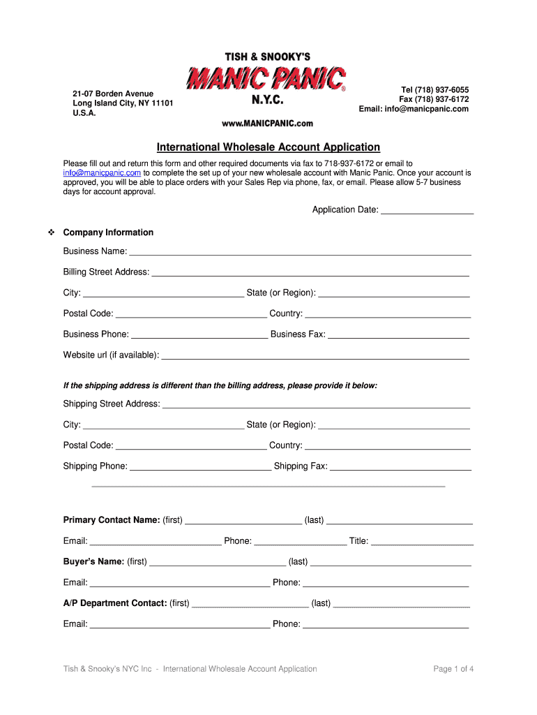 Tel (718) 9376055 Fax (718) 9376172 Email: info manicpanic.com 2107 Borden Avenue Long Island City, NY 11101 U.S.A. International Wholesale Account Application Please fill out and return this form