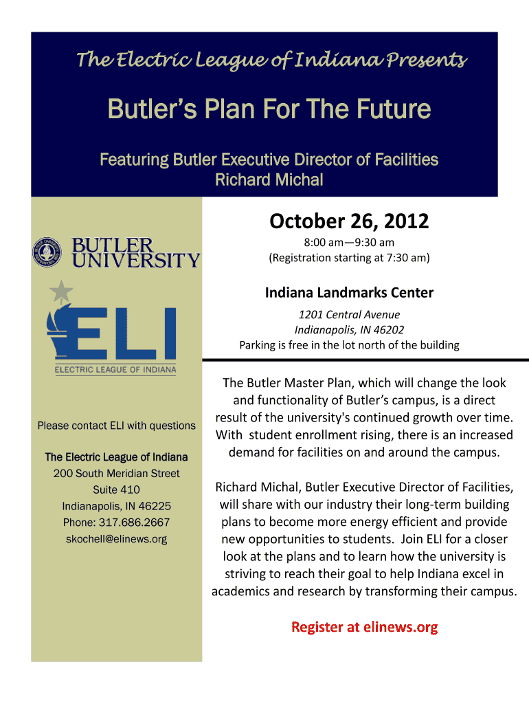 The Electric League of Indiana Presents Butlers Plan For The Future Featuring Butler Executive Director of Facilities Richard Michael October 26, 2012 8:00 am9:30 am (Registration starting at 7:30