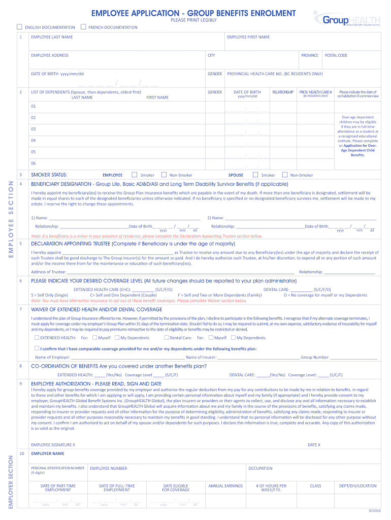 EMPLOYEE APPLICATION GROUP BENEFITS Enrollment PLEASE PRINT LEGIBLY ENGLISH DOCUMENTATION 1 FRENCH DOCUMENTATION EMPLOYEE LAST NAME EMPLOYEE FIRST NAME EMPLOYEE ADDRESS CITY DATE OF BIRTH YYY/mm/dd