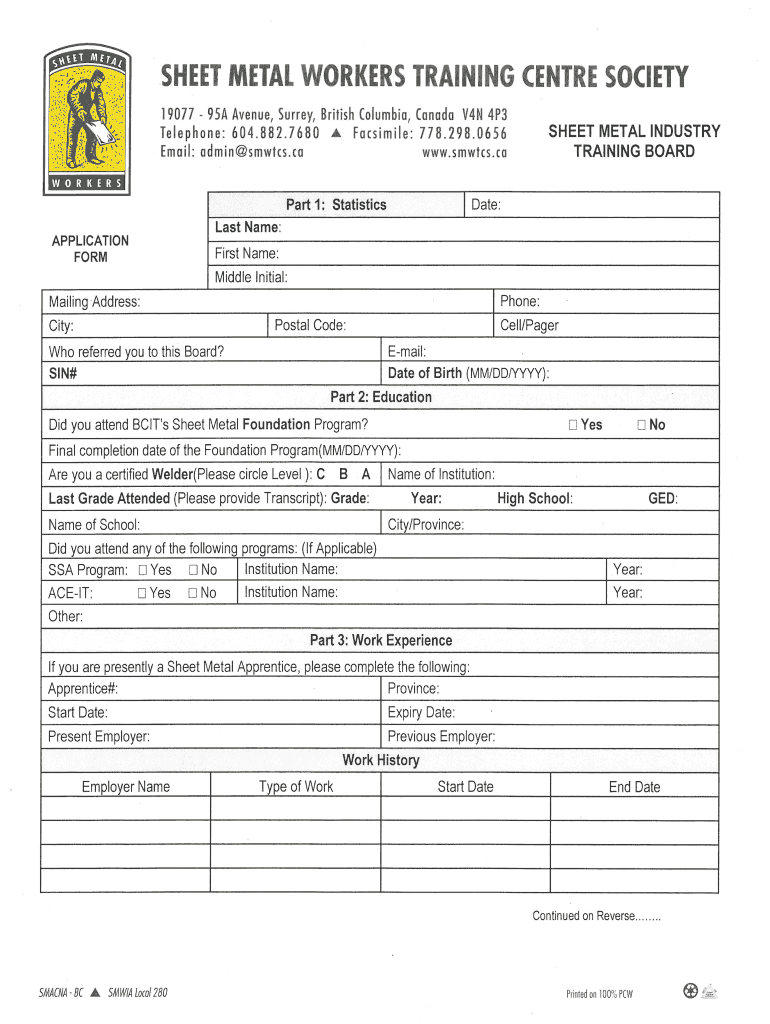 Get the free Application Form - Sheet Metal Workers Training Centre Society - smwtcs