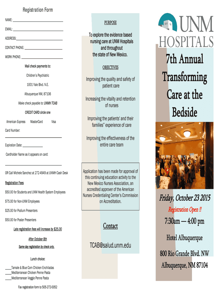 Registration Form NAME: EMAIL: ADDRESS: CONTACT PHONE: WORK PHONE: Mail check payments to: PURPOSE To explore the evidence based nursing care at UNM Hospitals and throughout the state of New Mexico.