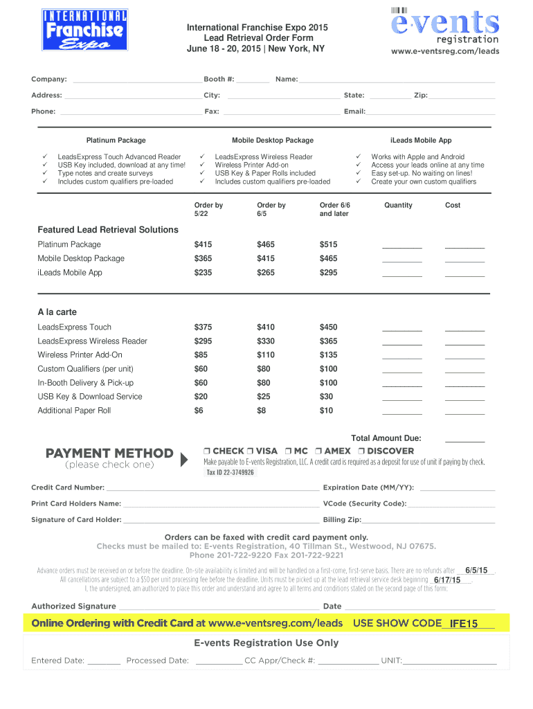 International Franchise Expo 2015 Lead Retrieval Order Form June 18 20, 2015 New York, NY Platinum Package LeadsExpress Touch Advanced Reader USB Key included, download at any time! Type notes and