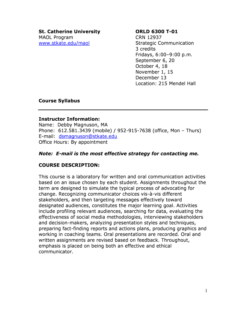St. Catherine University MAIL Program www.stkate.edu/maol OLD 6300 T01 CRN 12937 Strategic Communication 3 credits Fridays, 6:009:00 p.m. September 6, 20 October 4, 18 November 1, 15 December 13 Location: